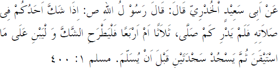 Dari Abu Sa’id Al-Khudriy, ia berkata : Rasulullah SAW bersabda, “Apabila seseorang diantara kalian syak (ragu-ragu) di dalam shalatnya, yaitu ia tidak tahu apakah ia telah shalat tiga atau empat raka'at, maka hendaklah ia buang yang syak (ragu-ragu) dan kerjakan mana yang ia yaqini, kemudian hendaklah ia sujud dua kali sebelum salam. [HR. Muslim 1: 400]