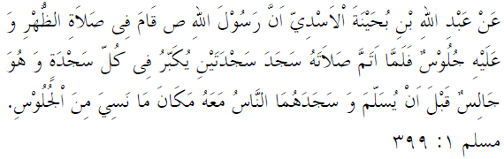 Dari Abdullah bin Buhainah Al-Asdiy bahwasanya Rasulullah SAW pernah bangkit berdiri dalam shalat Dhuhur padahal mestinya duduk (attahiyyat awwal), maka setelah selesai shalat, dalam keadaan duduk sebelum salam beliau bersujud dua kali, dan beliau bertakbir pada tiap-tiap sujud dan para makmum juga mengerjakan sebagaimana yang dikerjakan beliau untuk mengganti duduk (attahiyyat) yang terlupa itu". [HR. Muslim 1 : 399].