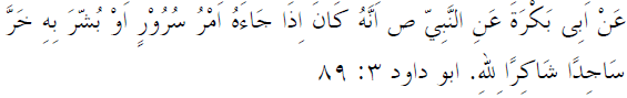Dari Abu Bakrah, dari Nabi SAW bahwasanya beliau dahulu apabila mendapat khabar yang menyenangkan, atau diberi khabar gembira, beliau lalu menyungkur sujud untuk bersyukur kepada Allah". [HR. Abu Dawud juz 3, hal. 89]