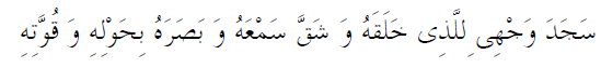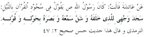 Dari ‘Aisyah, ia berkata : Adalah Nabi SAW membaca pada sujud Al-Qur'an (sujud tilawah) pada malam hari, “Sajada wajhii lilladzii kholaqohu wa syaqqo sam'ahu wa bashorohu bihaulihi wa quwwatihi (Bersujud diriku kepada Tuhan yang telah menciptakannya dan