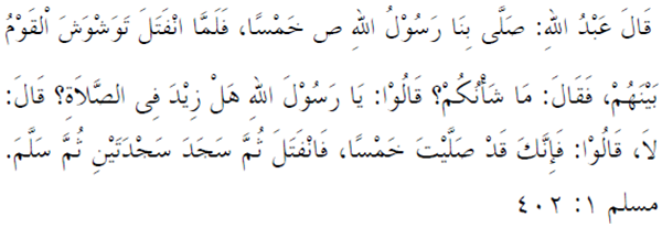 Telah berkata Abdullah : Rasulullah SAW pernah shalat bersama kami lima raka'at. Setelah selesai shalat, para shahabat berbisik-bisik diantara mereka. Maka Rasulullah SAW bertanya, "Ada apa kalian ?". Mereka menjawab, "Ya Rasulullah, apakah shalat ini ditambah ?". Rasulullah SAW menjawab, "Tidak". Para shahabat berkata, "Sesungguhnya engkau telah shalat lima raka'at". Maka Nabi SAW berpaling, lalu sujud dua kali kemudian salam. [HR. Muslim 1 : 402]